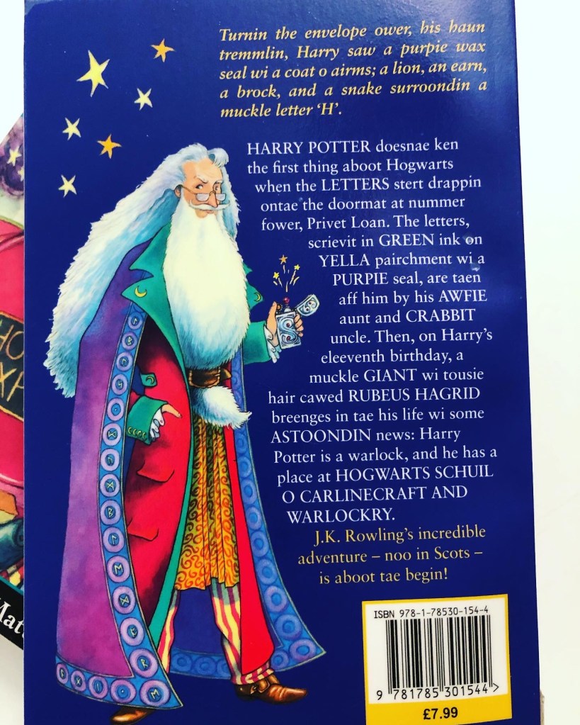 Det er Matthew Fitt som har stått for oversettelsen, og skotsk er det 80. språket Harry Potter og gjenget har blitt oversatt til. Jeg skulle gjerne hatt lydbok til denne, det hadde vært helt fantastisk å hørt. Wikipedia skriver at skotsk er et språk nært beslektet engelsk, med status som minoritetsspråk og det er på rødlista til UNESCO. Meget interessant for en språknerd som meg.