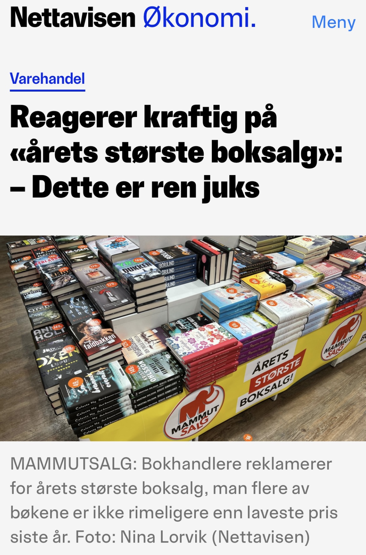 Artikkelen avslører at 4 av 5 bøker har vært billigere før dette salget. Maja Lundes Solvokteren er på salg til 229,-, på ARK med en førpris på 449,-. Den har faktisk kostet 129,- i løpet av det året som har gått nå. Helt utrolig. Vi blir jo lurt, folkens. Førprisen som blir oppgitt er jo rett og slett svindel på mange av de bøkene som er på «salg» nå. Svaret ARK kommer med er jo til å le av, «(..) Ingen av disse [titlene] har vært rabattert de siste fire til seks ukene.» Nei, men de har vært på tilbud det siste året. Skjerp dere! Jeg kommer garantert til å tenke både to og tre ganger neste gang Mammutsalget er i gang. Anbefaler å bruke Prisjakt og Prisguieden, der det som regel står prislogg eller -historie om hva varen har kostet i det siste.