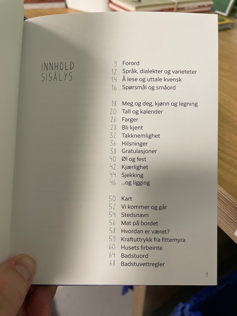 26. april 2005 ble kvensk offisielt anerkjent som eget språk her til lands, og er nå kvensk språkdag. Jeg velger å markere dagen ved å lese litt i den nye fraseboka fra Kvenungdommen og med å bruke min flotte juuret-skjorte (som kan kjøpes i Halti kvenkultursenters nettbutikk). Fraasikirja er en nyttig og fin bok for de som er litt nysgjerrig og vil lære litt kvensk uten at det blir for grammatisk og så videre. Man lærer blant annet spørreord, badstuvettregler, noen stedsnavn og kraftuttrykk fra fittemya.