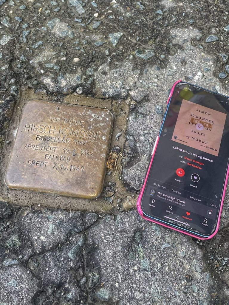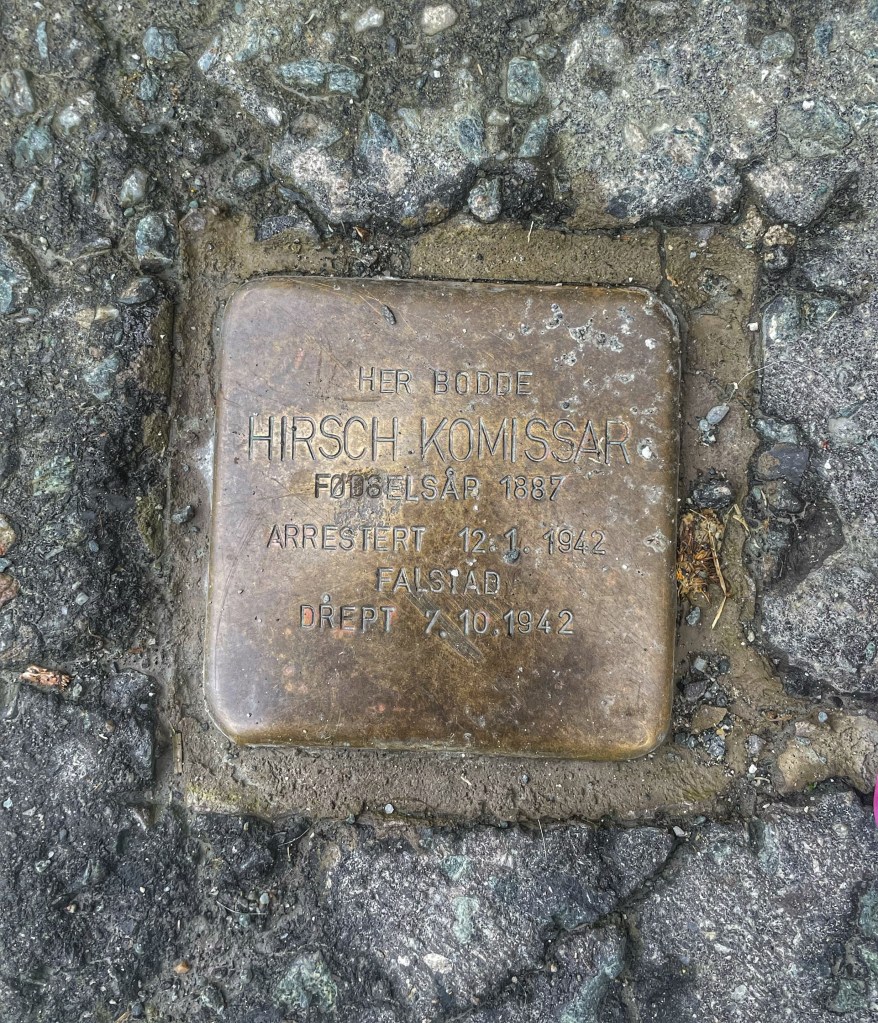 Snublesteinen til Hirsch Kommisar utenfor boligen deres, Munkegata 35, i Trondheim.