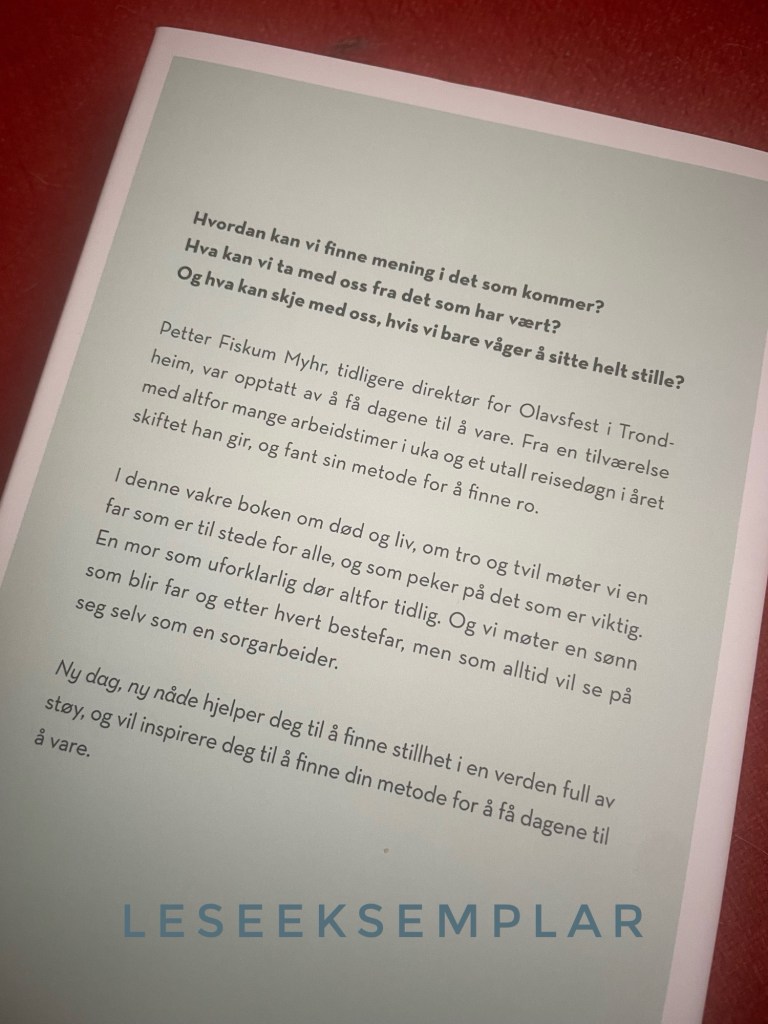 Hvordan kan vi finne mening i det som kommer? Hva kan vi ta med oss fra det som har vært? Og hva kan skje med oss, hvis vi bare våger å sitte helt stille? Petter Fiskum Myhr, tidligere direktør for Olavsfest i Trondheim, var opptatt av å få dagene til å vare. Fra en tilværelse med altfor mange arbeidstimer i uka og et utall reise døgn i året skiftet han gir, og fant sin metode for å finne ro. I denne vakre boken om død og liv, om tro og tvil møter vi en far som er til stede for alle, og som peker på det som er viktig. En mor som uforklarlig dør altfor tidlig. Og vi møter en sønn som blir far og etter hvert bestefar, men som alltid vil se på seg selv som en sorgarbeider. Ny dag, ny nåde hjelper deg til å finne stillhet i en verden full av støy, og vil inspirere deg til å finne din metode for å få dagene til å vare.